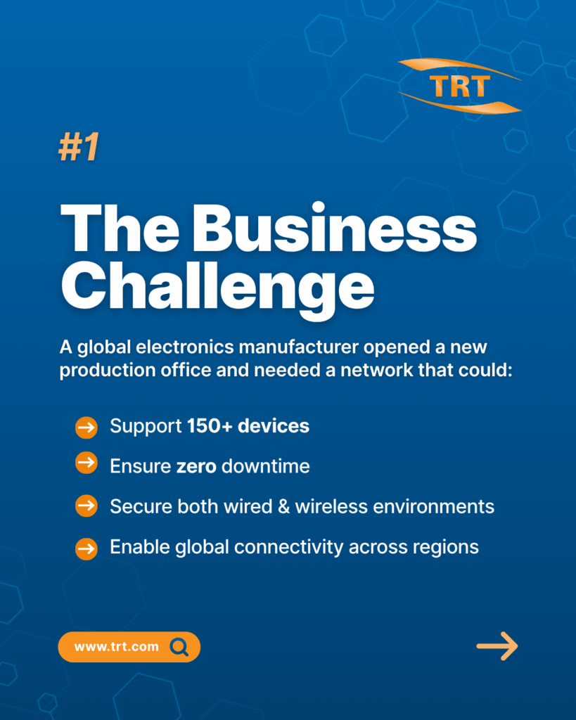 When a global electronics manufacturer launched a new production office in California, USA, they needed a secure, high-performance network infrastructure capable of supporting 150+ devices and enabling seamless cross-region operations.